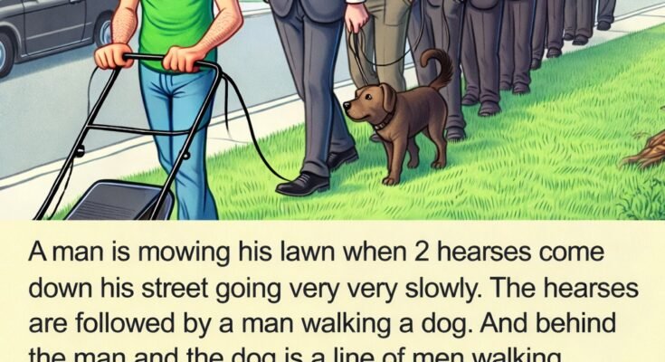 A man is mowing his lawn when 2 hearses come down his street going very very slowly.