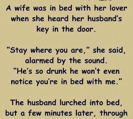 A wife was in bed with her lover when she heard her husband’s key in the door.