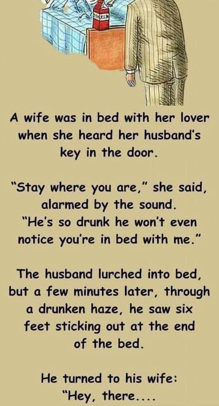 The husband lurched into bed, but a few minutes later, through a drunken haze, he saw six feet sticking out at the end of the bed. He turned to his wife: