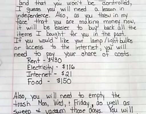 Heidi’s message wasn’t meant to be cruel or harsh; it was a wake-up call, a chance for Aaron to see life from a different perspective. As the letter went on, Heidi did something unexpected—she included a detailed bill for rent, food, and other household expenses, adding up to more than $700. She explained that if Aaron wanted to continue living in the house, he would need to pay his share of the costs, just as an adult would in the real world.