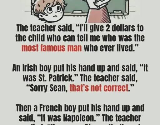 She clapped her hands once and said, “Alright class, today I have a special question. I’ll give two dollars to the child who can tell me who they think is the most famous man who has ever lived.”