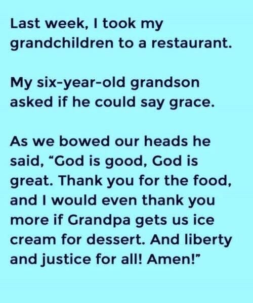 Last week, I took my grandchildren out for dinner, expecting nothing more than a quiet, simple evening together. The restaurant was warm and lively, filled with the gentle hum of conversation and the clinking of dishes. Before our meal arrived, my six-year-old grandson looked up and asked, in a soft and respectful voice, if he could say grace. I agreed, and everyone at our table paused. He folded his hands, bowed his head, and spoke with a sincerity that came naturally to him, expressing gratitude for the meal and even a hopeful wish for ice cream afterward.