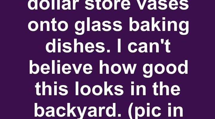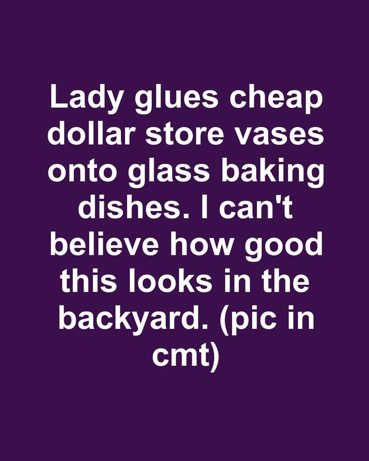 Lady glues cheap dollar store vases onto glass baking dishes. I can’t believe how good this looks in the backyard.