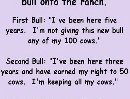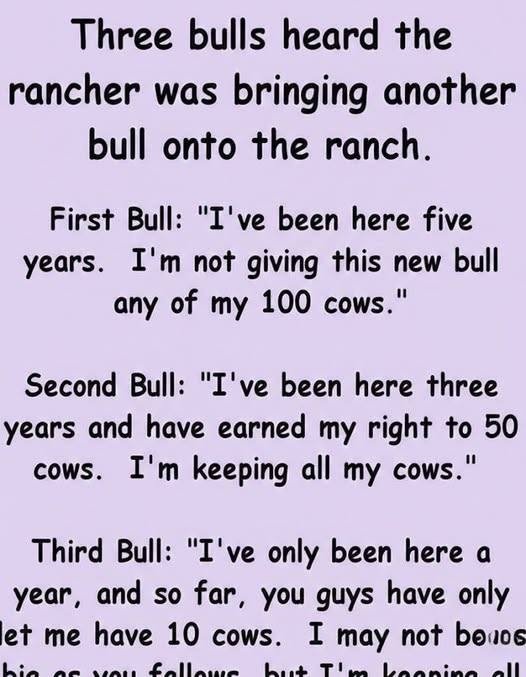- The first bull, seasoned after five years, declared: “I’m not giving up any of my 100 cows.”
