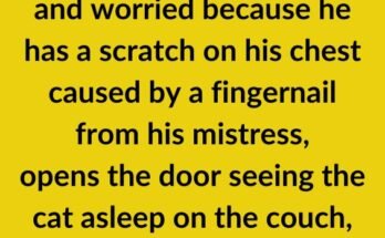 The husband comes home and worried because he has a scratch on his chest caused by a fingernail from his mistress, opens the door seeing the cat asleep on …