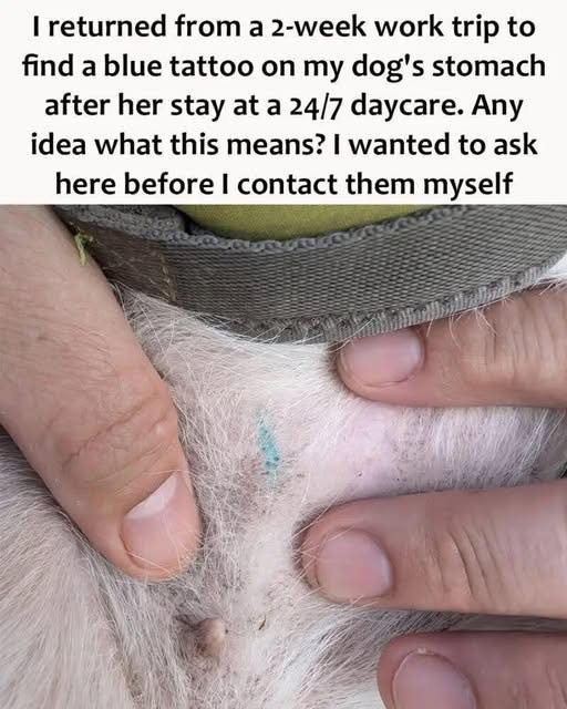 here before I contact them myselfReturning home from a two-week work trip, you were eager to reunite with your beloved dog, who had been staying at a 24/7 daycare facility. However, upon closer inspection, you noticed something unusual—a blue tattoo on her stomach. This unexpected discovery has left you puzzled and concerned about what it might signify.