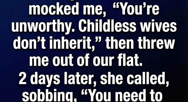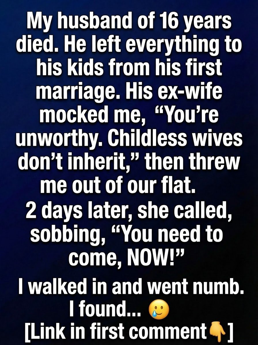 Marina had been married to Elias for sixteen years, years filled with quiet routines and shared dreams. When he passed away unexpectedly, grief hit her like a wave she could barely stand against. At the reading of the will, she sat still, hands folded tightly, expecting at least the home they had built together to remain hers. But the lawyer’s words were clear: everything had been left to Elias’s children from his first marriage. The room felt colder with each sentence. When she stepped outside afterward, his ex-wife, Nadine, stood waiting, her expression sharp as glass. “You were never meant to have anything,” Nadine said. “Childless wives don’t inherit.” Then, without hesitation, she told Marina to leave the flat immediately. In shock and exhaustion, Marina left with only a small suitcase and a heart too heavy to protest.