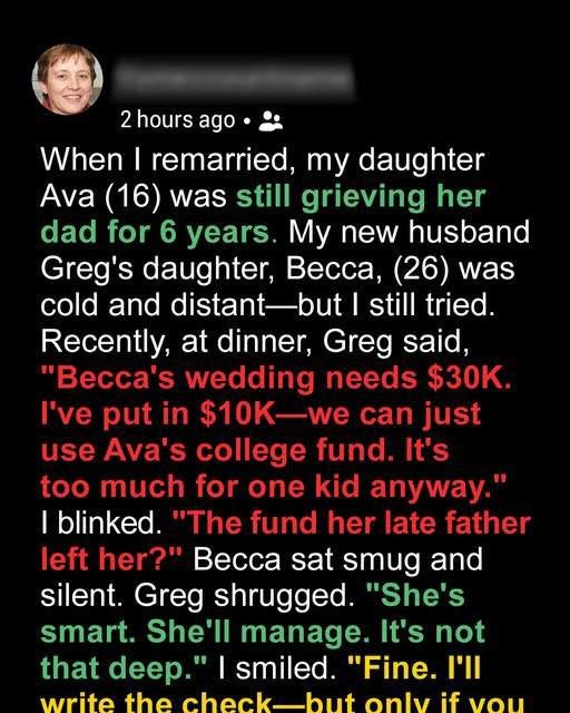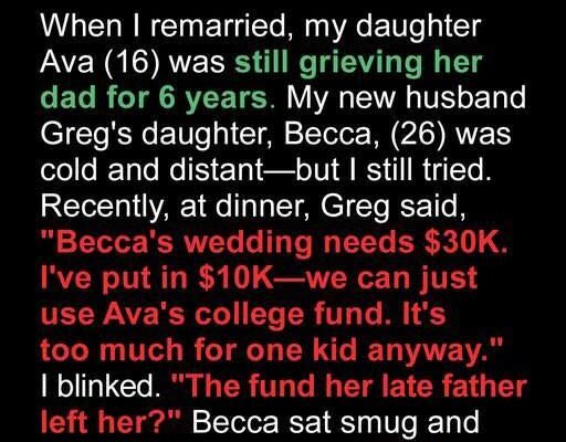 When Greg casually suggested using Avaâs college fund to pay for his adult daughter Beccaâs wedding, I was stunned. That fund was created by Avaâs late father, David â his last gift to ensure sheâd have the future he never did. Gregâs tone carried entitlement, and Beccaâs silence spoke volumes, as if this decision had already been made without me. I stayed calm, knowing I needed a clear plan to protect what truly mattered.