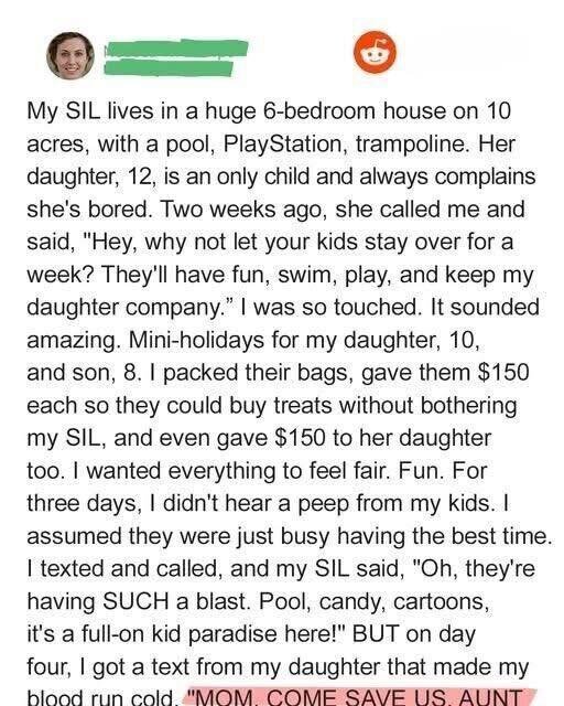 When my sister-in-law invited my children to spend a week at her large, luxurious home, I truly believed it would be the highlight of their summer. She had a pool, a trampoline, and every gaming system imaginable. She explained that her daughter, Mikayla, was bored and could use some company, so I happily agreed. I packed my kidsâ bags, reminded them to be polite guests, and even gave them spending money so they could enjoy snacks and small treats during their stay.
