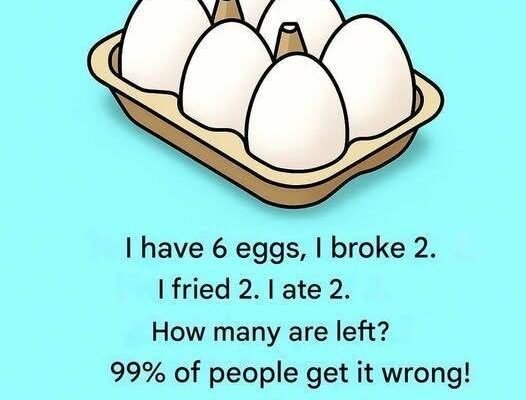 The riddle usually goes like this: “I have 6 eggs. I broke 2, fried 2, and ate 2. How many eggs are left?” Many people immediately answer “zero,” because they assume the riddle is talking about six different eggs being used. Their minds quickly add it up: 2 eggs broken + 2 eggs fried + 2 eggs eaten equals 6, so they believe nothing remains.
