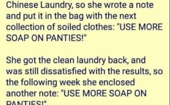 A woman was unhappy with the way her laundry was done at the local Chinese Laundry, so she wrote a note and put it in the bag with the next …
