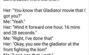 My daughter just phoned me and the conversation went like this!.. Her: “You know that Gladiator movie that I got you?” Me: “Yeah. “Her: “Wind it forward one hour, 16 …