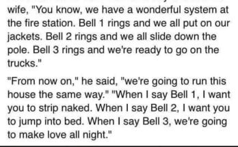 A fireman came from work one day and told his wife, “You know, we have a wonderful system at the fire station. Bell 1 rings and we all put on …