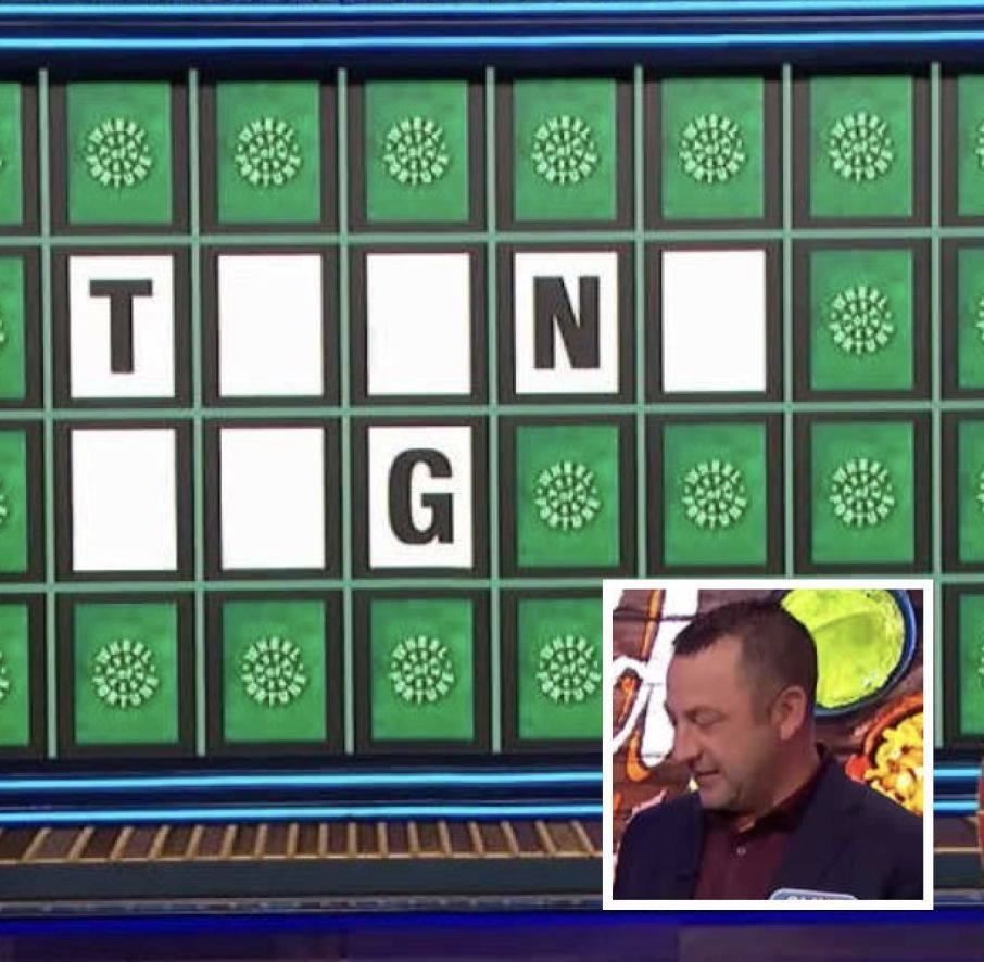 Then came the Bonus Round — and the puzzle that crushed Ingalls’ hopes for a new car. Selecting “Phrase” as his category, Ingalls faced a short, two-word challenge. After the standard letters R, S, T, L, N, E appeared, the puzzle showed: T _ _ N _ _ _ G. For his extra picks, Ingalls chose G, A, M, and Y, but that left him with very little to work with.