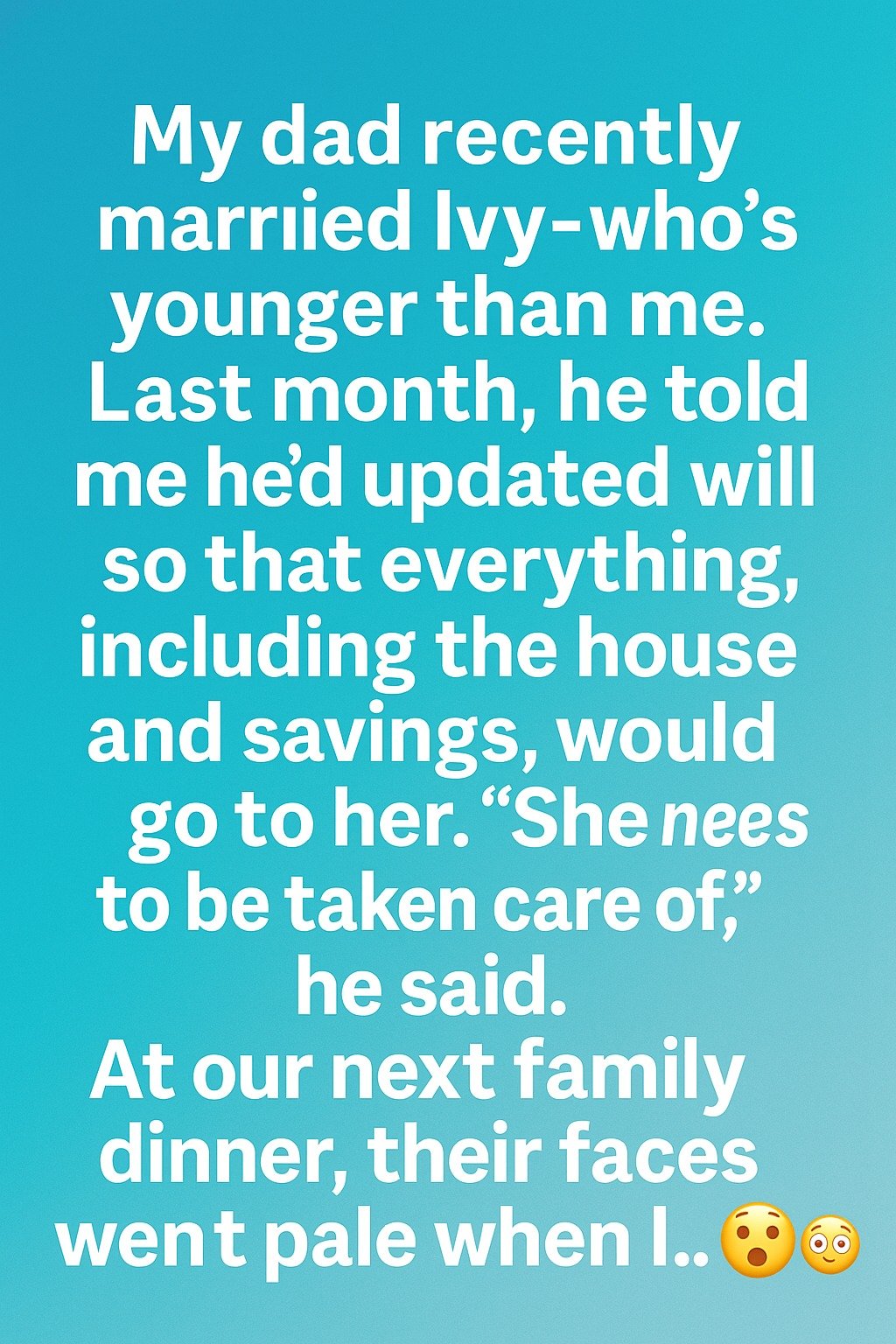 My dad recently married Ivy who’s younger than me. Last month, he told me he’d updated his will so that everything, including the house and savings, would go to her. “She needs to be taken care of,” he said. At our next family dinner, their faces went pale when I calmly stood up, cleared my throat, and said, “Dad, I have something to share too.”